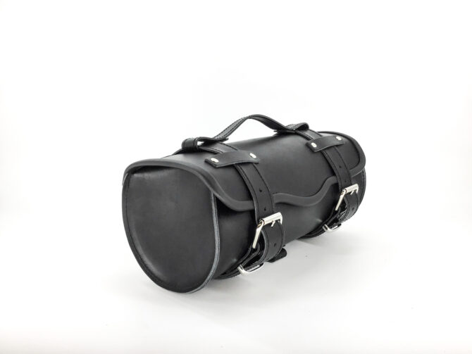 Een stoere zwart leren bagage-roltas met een stevig handvat. De roltas is handgemaakt van 100% kwaliteitsleer.